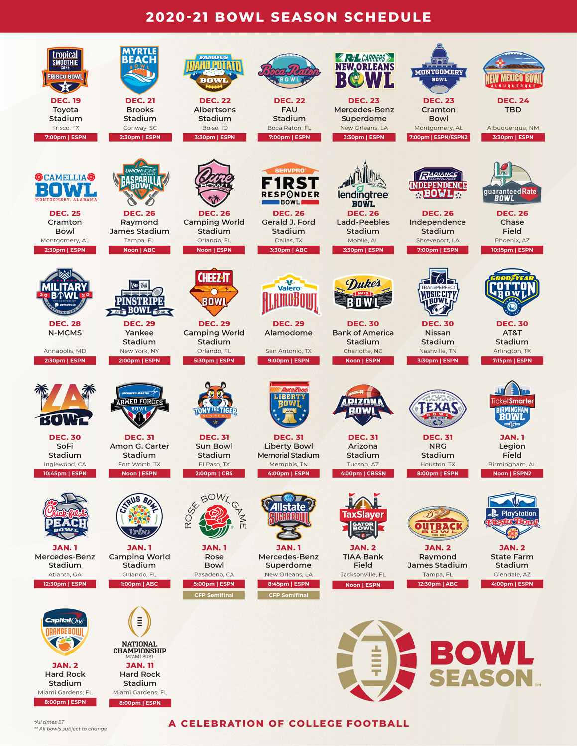 The 2020-2021 Bowl Season schedule is as follows: